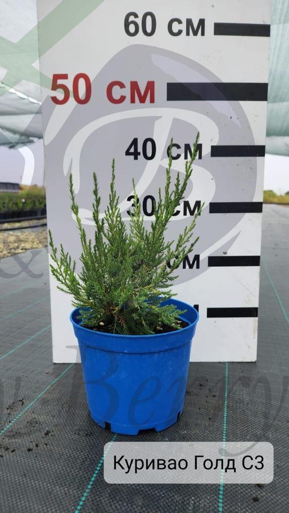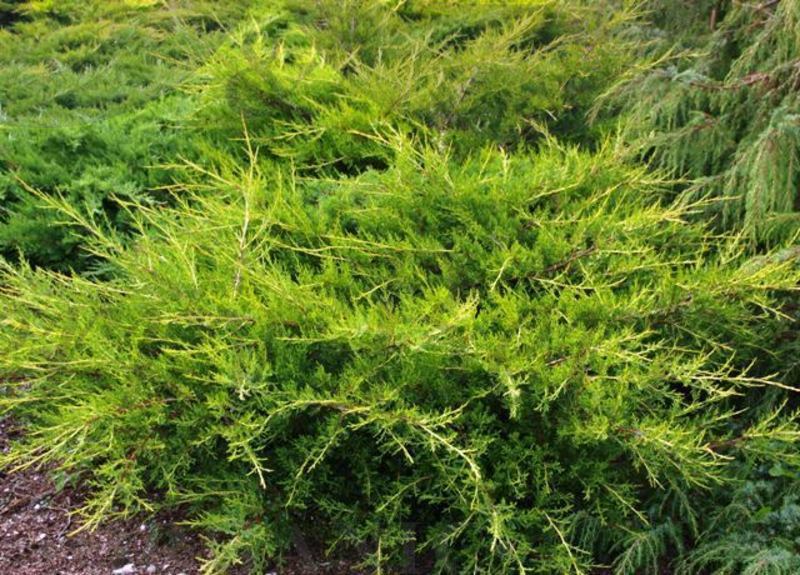 Сильнорослый хвойный кустарник с ажурной широкой, часто асимметричной кроной. Высота взрослого растения 1,5-2м и столько же в диаметре. Ветви широкие, раскидистые, растут вверх. Молодые побеги яркого золотистого цвета очень декоративно выглядят на фоне более зеленой чешуйчатой хвои. Годовой прирост до 15 см в год.