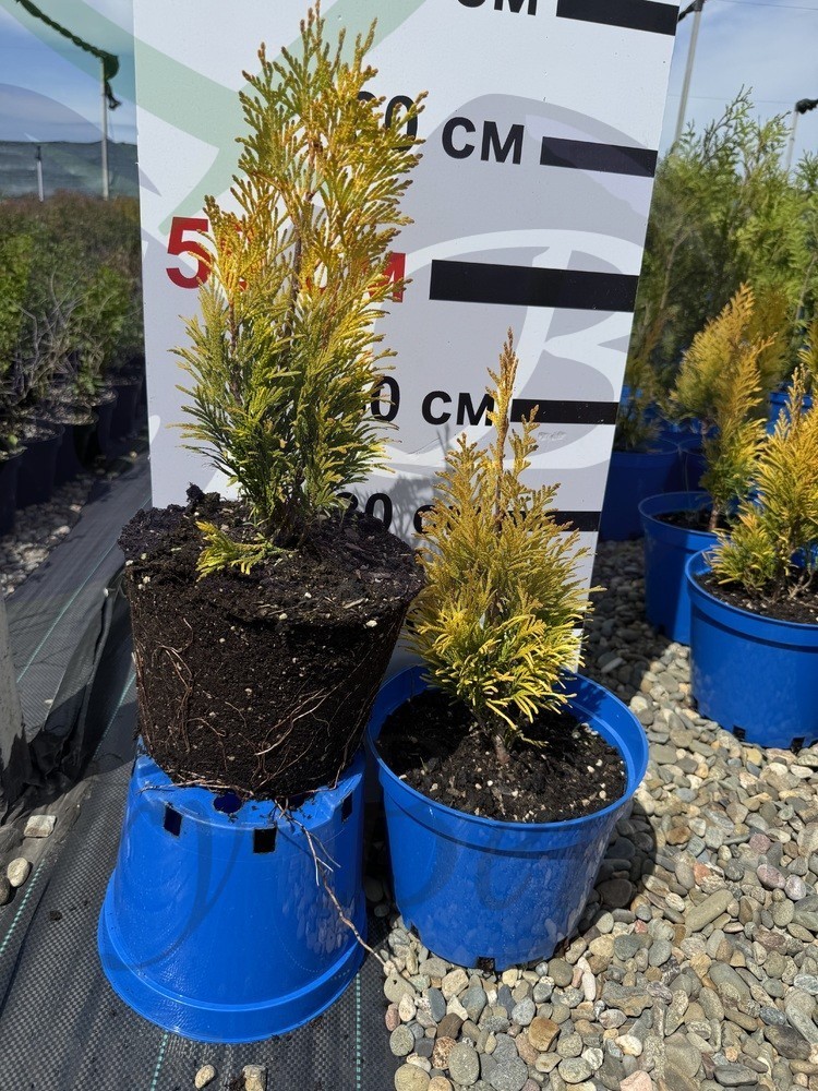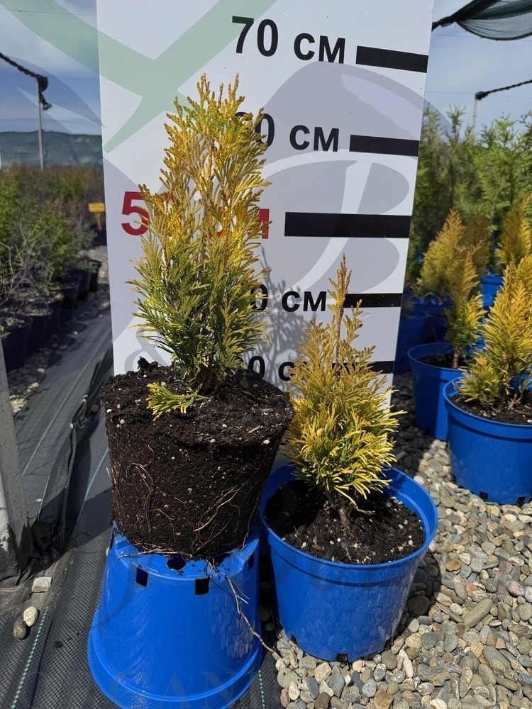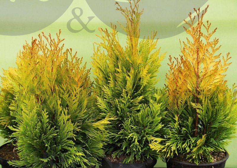 Туя складчатая Фореве Голди - хвойное растение. Взрослое растение, при благоприятных условиях выращивания имеет высоту 2.0 м, диаметр 1.0 м. Годовой прирост в среднем по высоте 5-7 см, один раз в год. Окраска летом светло-зелёная с желтоватым оттенком, осенью оранжево-красная, зимой золотисто-желтая. Крона коническая.